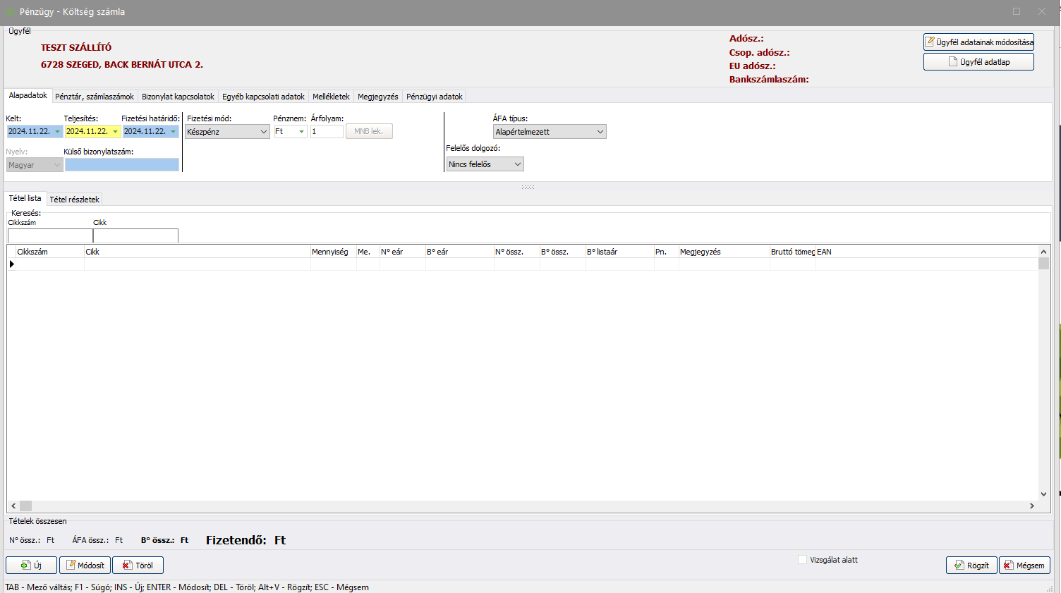 - Szállító: akinek a költség számláit rögzíteni kívánjuk, azaz a bizonylatok kiállítója. A Szállító mezőben található