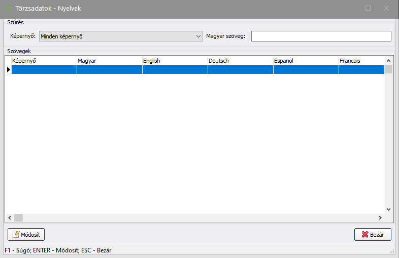 Ha egy megadott szöveget szeretne idegen nyelvre fordítani, kattintson duplán a megfelelő sorra, vagy kijelölés után nyomja meg a (Módosít) gombot. Ha egy kifejezésnek megadta a kívánt (vagy akár az összes) nyelven a fordítását, rögzítse azt.