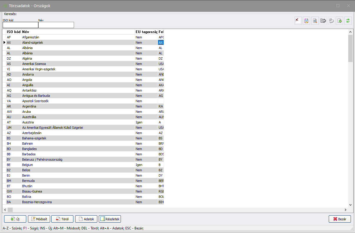 Elérése: Törzsadatok -> Egyéb -> Országok