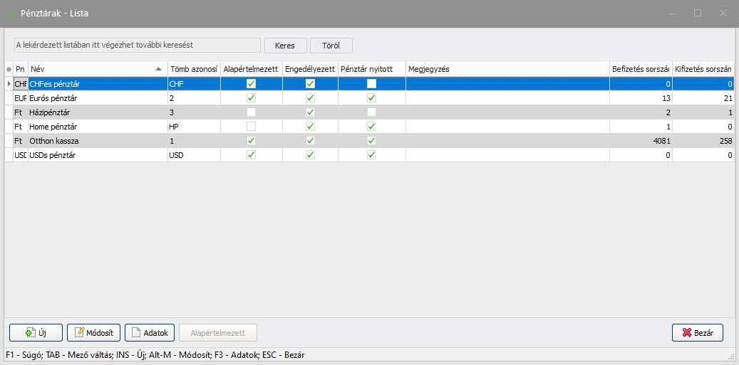 A Pénztárak listájában látható, mely pénztár engedélyezett, mely nyitott, és melyik pénztár van beállítva alapértelmezettnek, amennyiben az adott pénznemből több pénztár került létrehozásra.