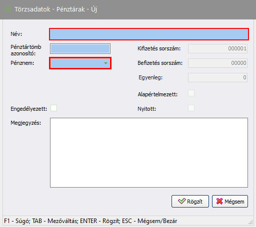 Csak olyan pénznemmel lehetséges pénztárat létrehozni, amely pénznem fel lett véve a Törzsadatok - Egyéb - Pénznem törzs menüben. (Bővebben: Pénznem törzs.)