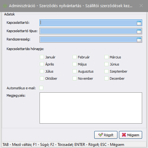 Ezen a felületen rendelhet a szerződéshez kapcsolattartót, kiválasztva a felelős munkatársat és megadva a kapcsolattartás fajtáját és gyakoriságát.