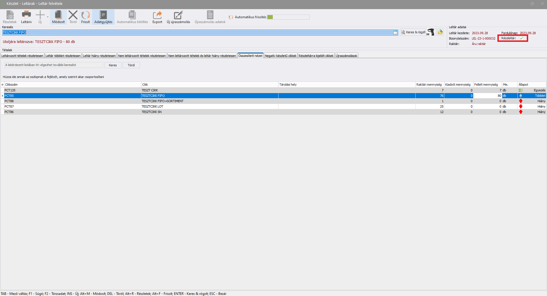 Részleltár mező bepipált állapota mutatja, hogy adott leltár részleltár-e.