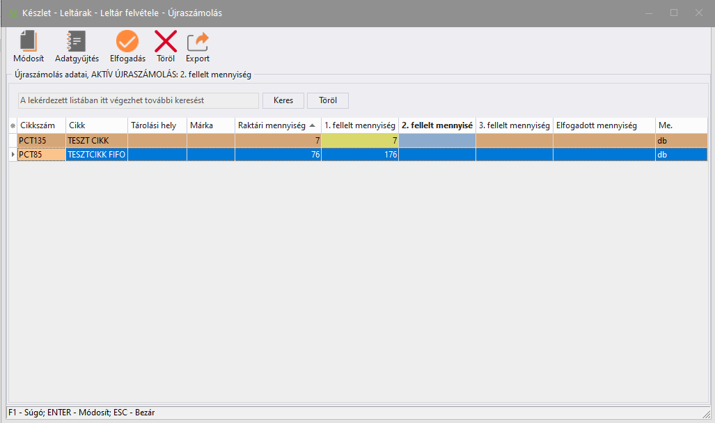 Az Újraszámolás funkció a leltár folyamata közben teszi lehetővé a már rögzített tételek újraszámolását. A részleltár és a teljes leltár esetében is elérhető, de csak FIFO készletkezelési módú termékek esetében használható.