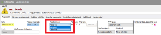 Vevői rendelés bizonylat karbantartásakor - amennyiben a vevőhöz tartozó fizetési módot szeretné megváltoztatni - csak az Egyedileg engedélyezett fizetési módok listában szereplő fizetési módok küzül lehet választani.