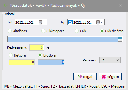Fix áras cikk jelölésénél szerkeszthető. Ezen az áron fogja a vevő megvenni a terméket. A nettó-bruttó jelölő állásának megfelelően adható meg az ár. Alapértelmezett állása paraméterben beállítható, amely bármikor kézzel megváltoztatható. |