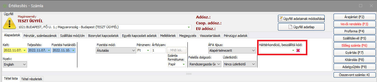 A Beszállítói kód csak az egyedi bizonylatképekkel (Szállítólevél - Formázott 2 logóval, Számla/Proforma - Formázott 4 (logóval), Vevői rendelés - Formázott 3) kiállított bizonylatok esetében jelenik meg. Ebben az esetben a bizonylatkészítő ablakban megjelenik a Háttérkondíció, beszállítói kód mező, amelyben a Vevő törzsben előzetesen rögzített beszállítói kódok választhatók ki. Rögzítéskor a rendszer az Ügyfél törzs aktuális állapota alapján menti el az elkészült bizonylatkoz a Beszállítői kód és Háttérkondíció adatokat.