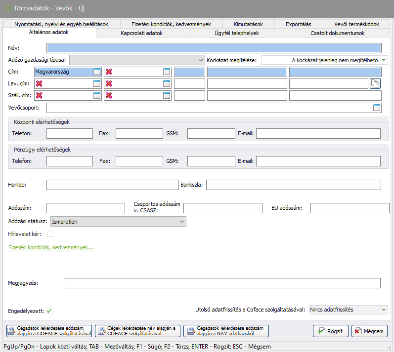 Elérése: Törzsadatok -> Vevő törzs -> (Új) gomb