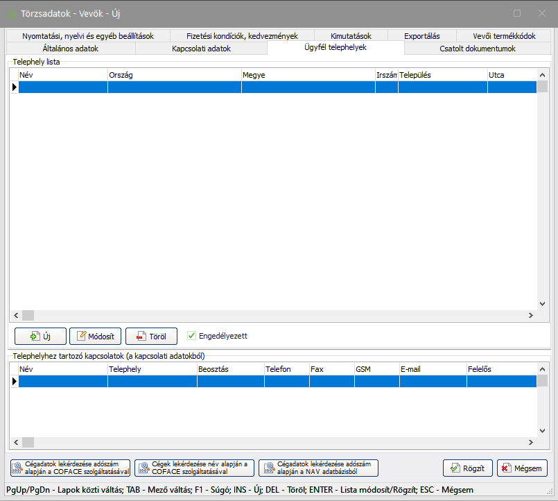 - Az Ügyfél telephelyek fülön szükség esetén rögzítsen új Telephelyet!