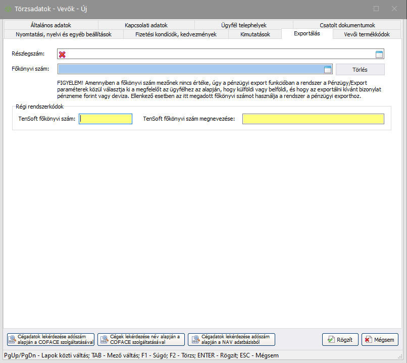 Ezen a fülön a könyvelőprogramok számára átadandó adatokat rögzítheti a vevőhöz.