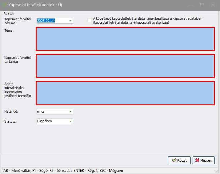 - A Kapcsolati adatok fülön szükség esetén rögzítsen új Kapcsolatot! Amennyiben egy újonnan rögzített Kapcsolathoz új, előre rögzített dátumú Kapcsolatfelvételt is szeretne bejegyezni, rögzítsen új Kapcsolat felvételt!