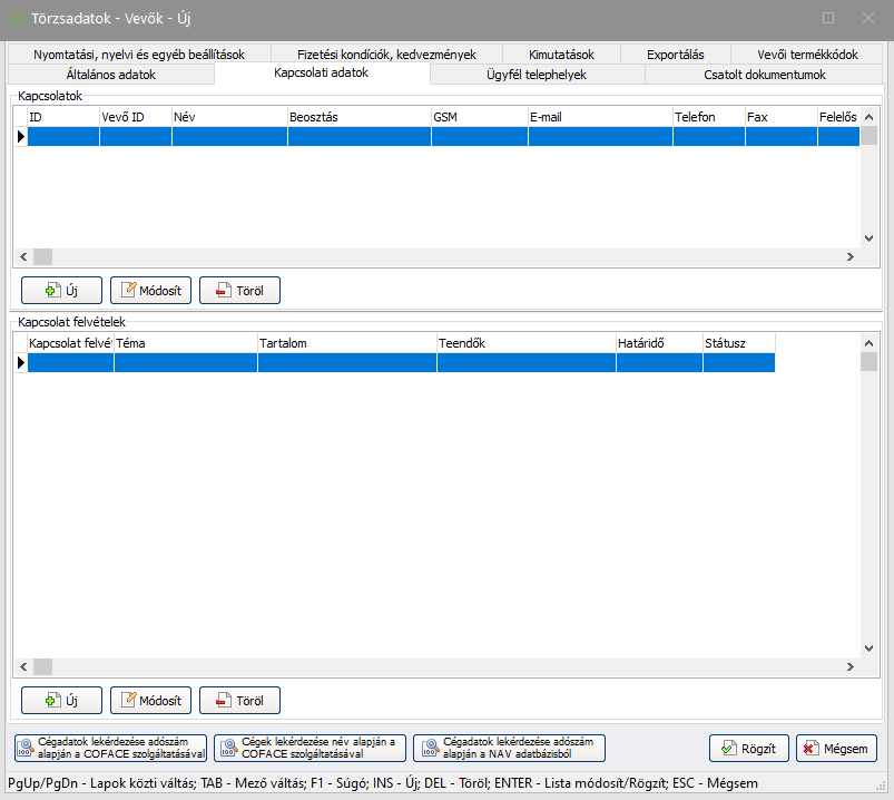 Új vevő létrehozásakor a megjelenő ablakban az alábbi fülekkel találkozhat: (ezeket alább részletesen bemutatjuk):