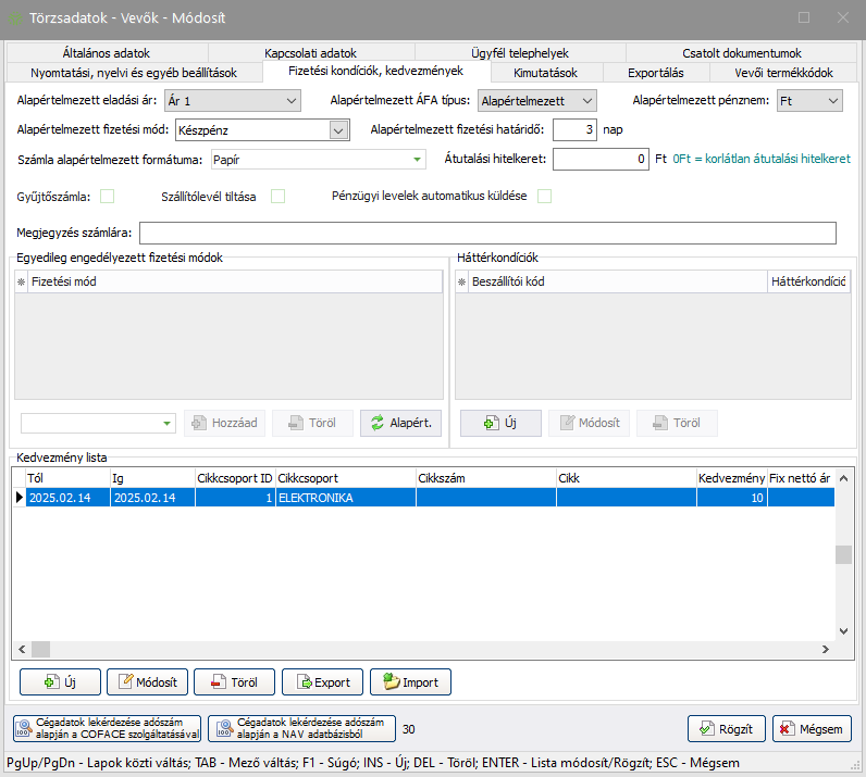 - A Fizetési kondíciók, kedvezmények fülön opcionálisan beállíthat a vevő számára cikkcsoport(ok)ra és/vagy cikk(ek)re érvényes kedvezményeket, árakat, fizetési módot, háttérkondíciókat.