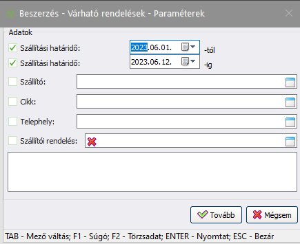 A lekérdezés tárgya egy paraméterező ablakban adható meg. A lekérdezés használható egy vagy több paraméterrel, illetve paraméter nélkül is. Utóbbi esetben az összes, még fel nem dolgozott Szállítói rendelés tételét visszaadja a program, köztük akár a már évek óta nem aktuális, de ki nem törölteket is.