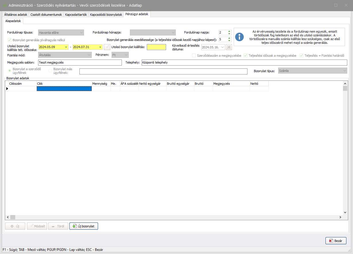 Itt adhatóak meg a szerződéshez kapcsolódó pénzügyi adatok. Ezek segítségével a rendszeres bizonylatkészítés könnyíthető meg. A fordulónappal kapcsolatos adatok alapján számolja ki a program a teljesítési időszakot. A bizonylatkészítési adatok alapján figyelmeztet a rendszer, amikor a bizonylat kiállítása esedékes. A figyelmeztetéseket a számlázási értesítések menüpont alatt tekintheti meg. Miután a bizonylathoz szükséges összes adatot megadta, a bizonylatkiállítás egy gombnyomással elvégezhető.