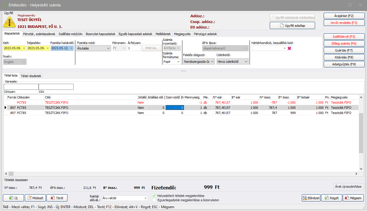 Mivel az ügyfél adatai a helyesbítő számlával nem javíthatók (ebben az esetben a sztornó számla, majd új számla készítése a megoldás), így a helyesbítő számlán az ügyfél adatai a helyesbített számlával megegyezően szerepelnek, a rendszer nem az ügyfél törzset veszi figyelembe.